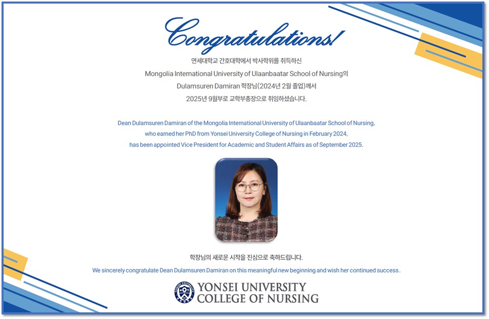 News [Spotlight] Appointment of Dean Dulamsuren Damiran as Vice President for Academic and Student Affairs 관리자 2025-09-12 조회수 525 공유하기 공유하기 페이스북 네이버블로그 카카오톡 카카오스토리 닫기 목록 이전글연세대학교 간호대학생, '유일한 아카데미' 수상 다음글연세대 간호대학 석사과정생 3명, 홍콩중문대 PhD Summer Workshop 추천 및 참여