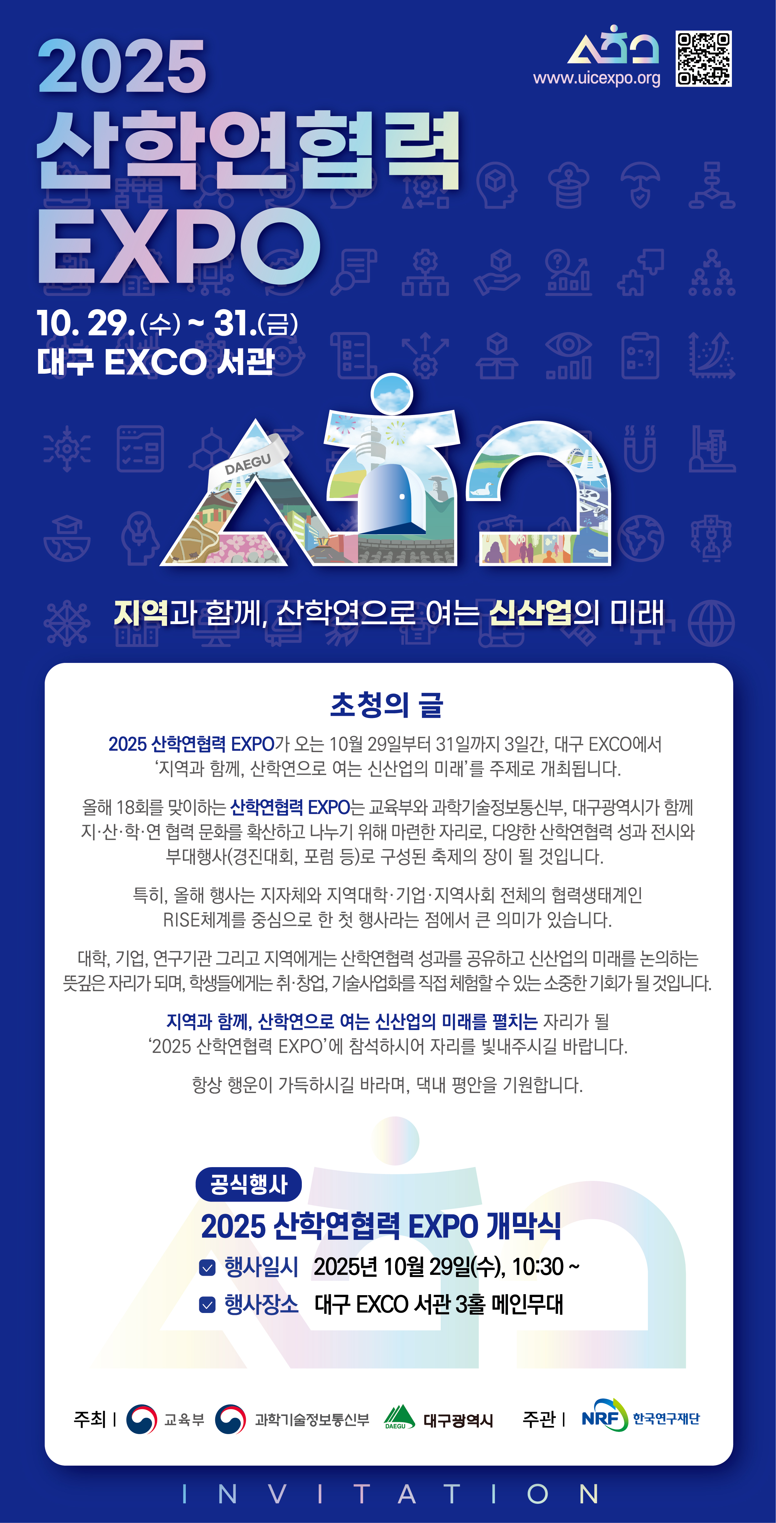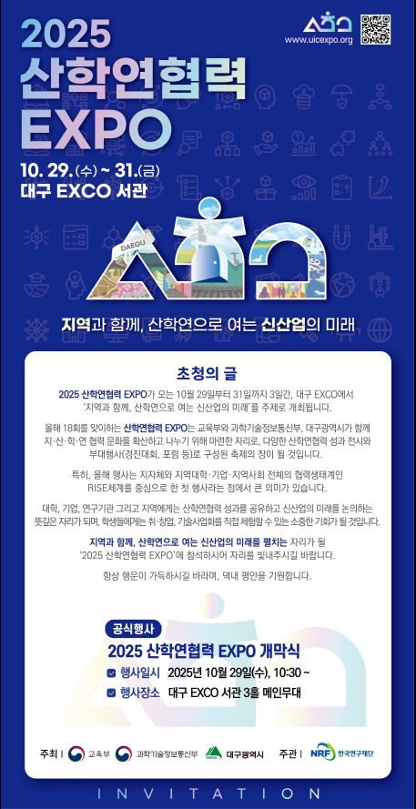 사업공고 [한국연구재단] 2025 산학연협력 EXPO 개최 안내 관리자 2025-10-27 조회수 122 붙임3. 2025 산학연협력 EXPO 초청장.jpg 붙임3. 2025 산학연협력 EXPO 초청장(외3).zip 2025 산학연협력 EXPO 개최 안내 목록 이전글[과기정통부 보도자료(25.10.26)] R&D 혁신을 위한 연구현장 간담회 개최 다음글다음글이 없습니다.